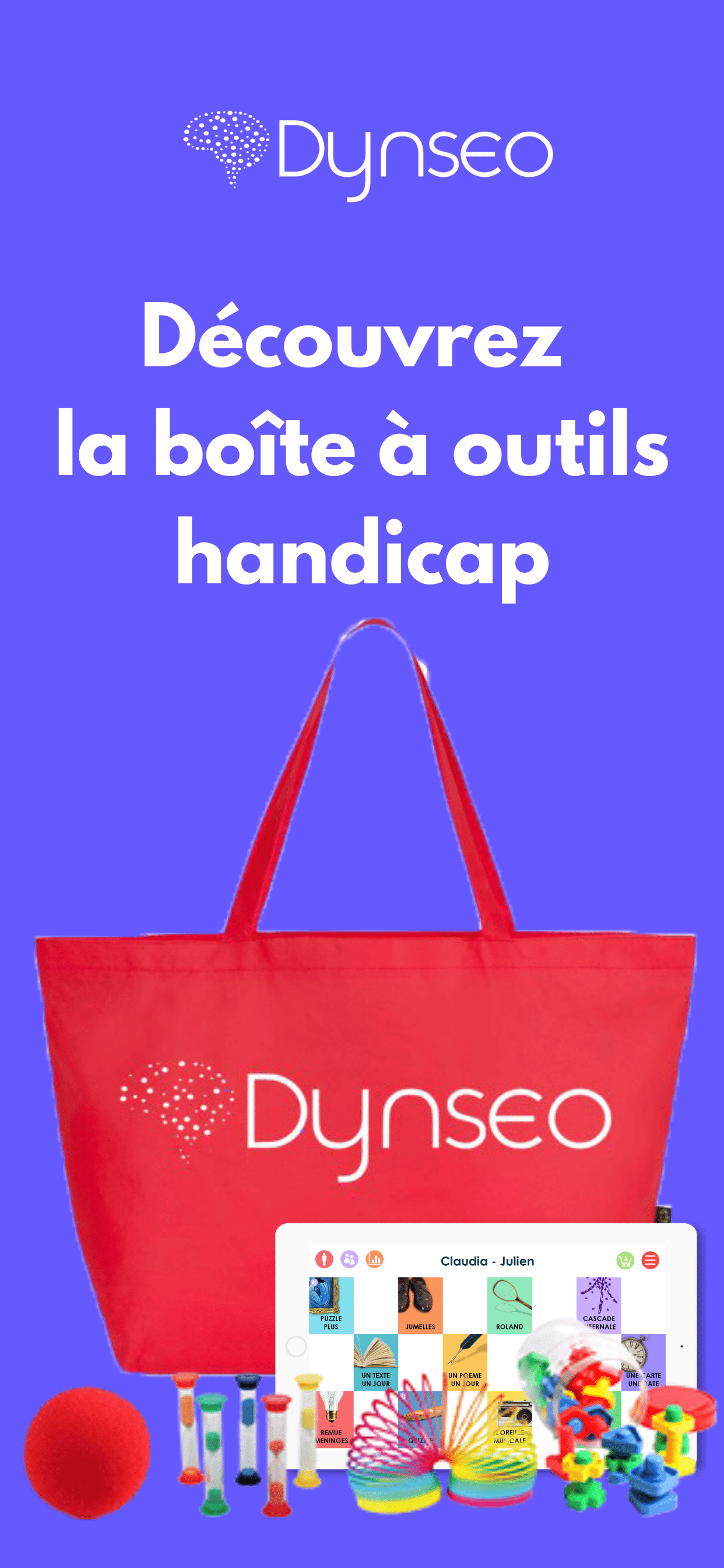 Dynseo a développé une boîte à outils numériques pour proposer aux intervenants (exemple auxiliaires de vie) des outils simples pour prendre en charge des patients en situation de handicap, en les stimulant et en les valorisant tout en leur faisant plaisir. La boite à outils contient des choses diverses et variées comme par exemple des applications afin de stimuler les fonctions cognitives, des accessoires physiques et bien-être sont également proposés afin d’assurer la complémentarité : balle en mousse, kit manucure et massage, sabliers. La boite à outils est vendue au prix de 199 euros sans tablette et au prix de 386 euros avec tablette. A savoir : Cette boite à outils s'adresse aux professionnels de santé et éducateurs avec pour objectif de les aider dans la prise en charge des patients en situation de handicap.